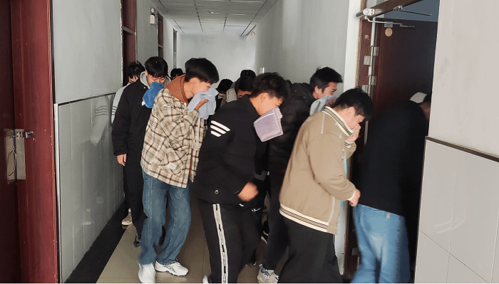 下午2:00,全体参演师生到四号公寓楼集合,罗占军老师对全体参演师生进行了消防安全知识和逃生疏散培训。随后,机械工程系学生在辅导员张晓雨的带领下进入楼内演练位置,工作人员按照演练方案到各楼层、各楼道口和疏散门前待命,准备对逃生学生进行疏导。准备就绪后,随着一声哨响,演练开始,工作人员点燃烟雾弹,宿舍管理员拉下电磁锁开关,宿舍各疏散门全部打开,同学们依次在浓烟滚滚中有序快捷的逃生疏散。不到三分钟,参加演练的同学全部安全撤离火灾演练现场,火灾逃生疏散演练活动圆满结束。