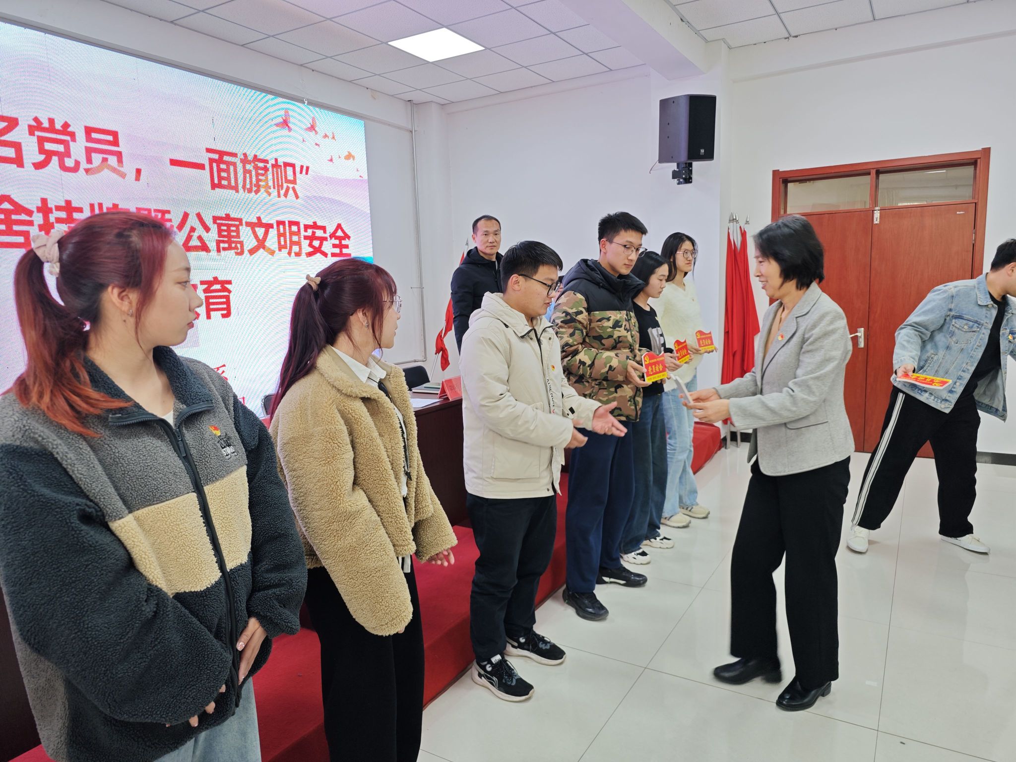 最后,会议进行了党员宿舍授牌仪式,荆秀萍向学生党员代表颁发了党员宿舍门牌,并组织进行了安全承诺书签字活动。