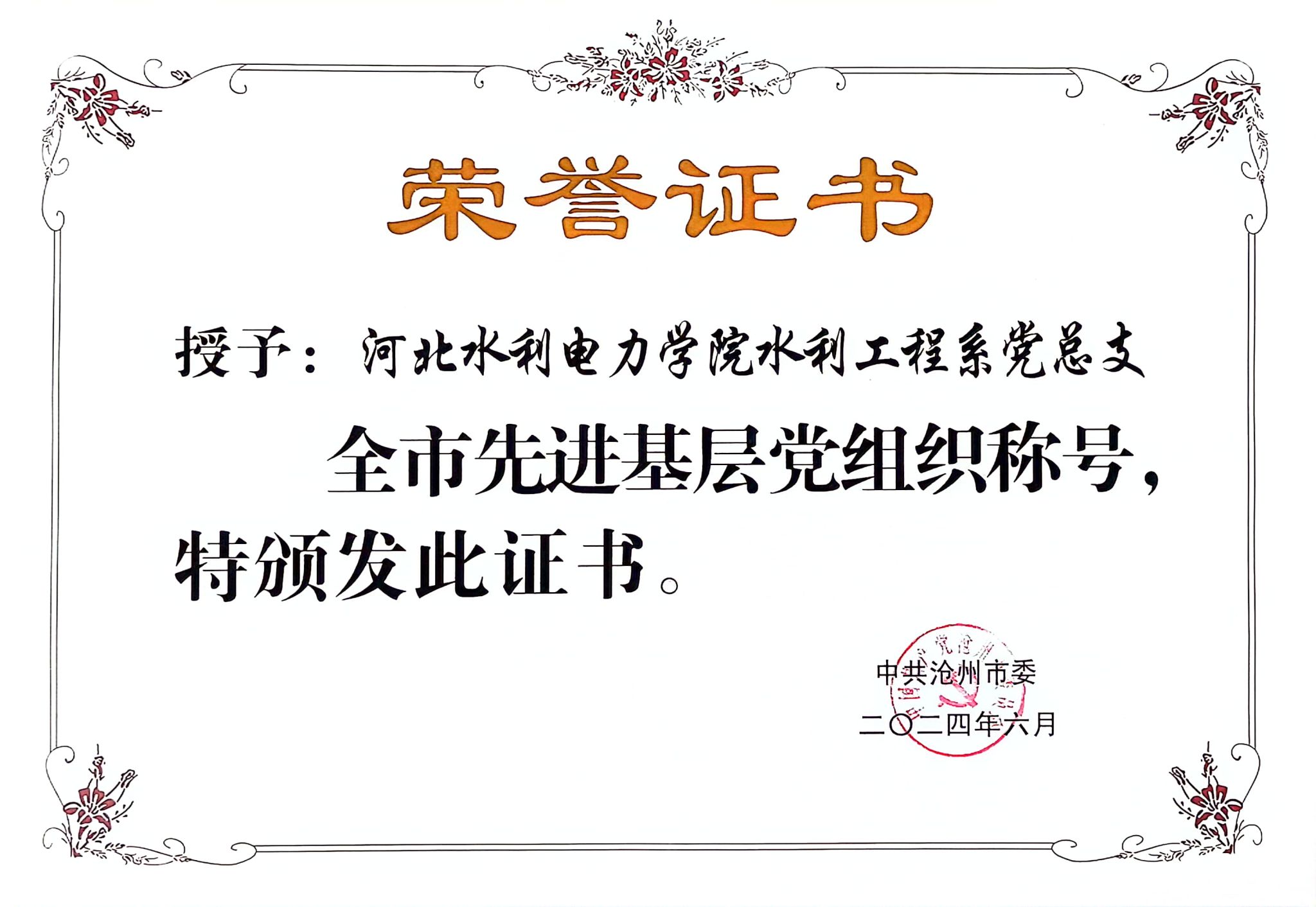 在庆祝中国共产党成立103周年之际,沧州市委决定表彰一批优秀共产党员、优秀党务工作者和先进基层党组织,水利工程系党总支被授予“全市先进基层党组织”荣誉称号。