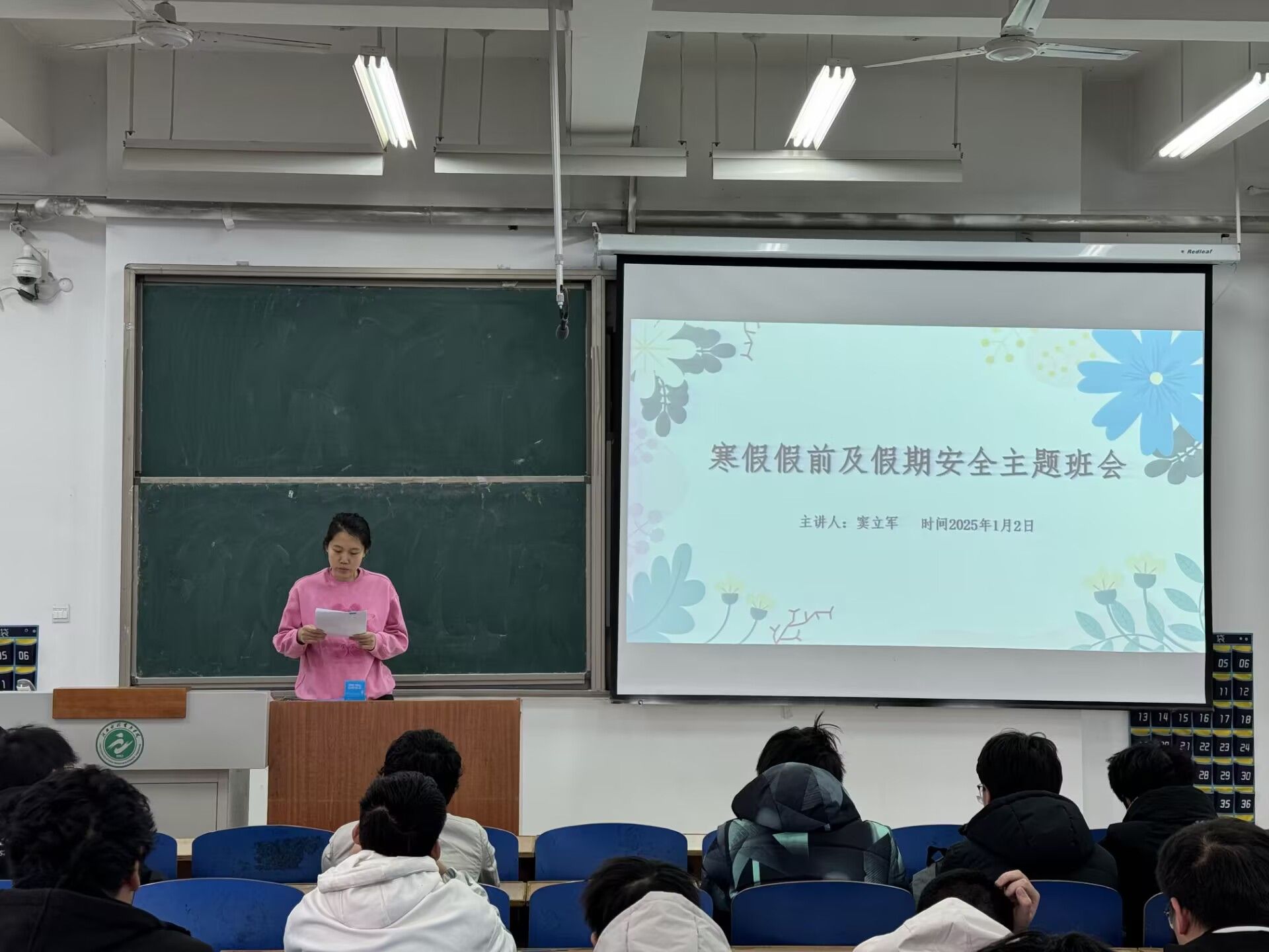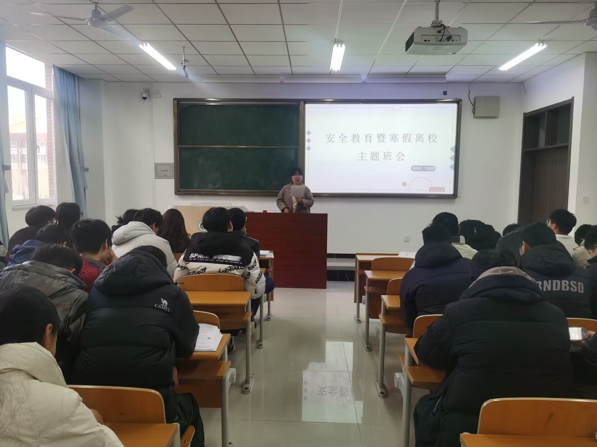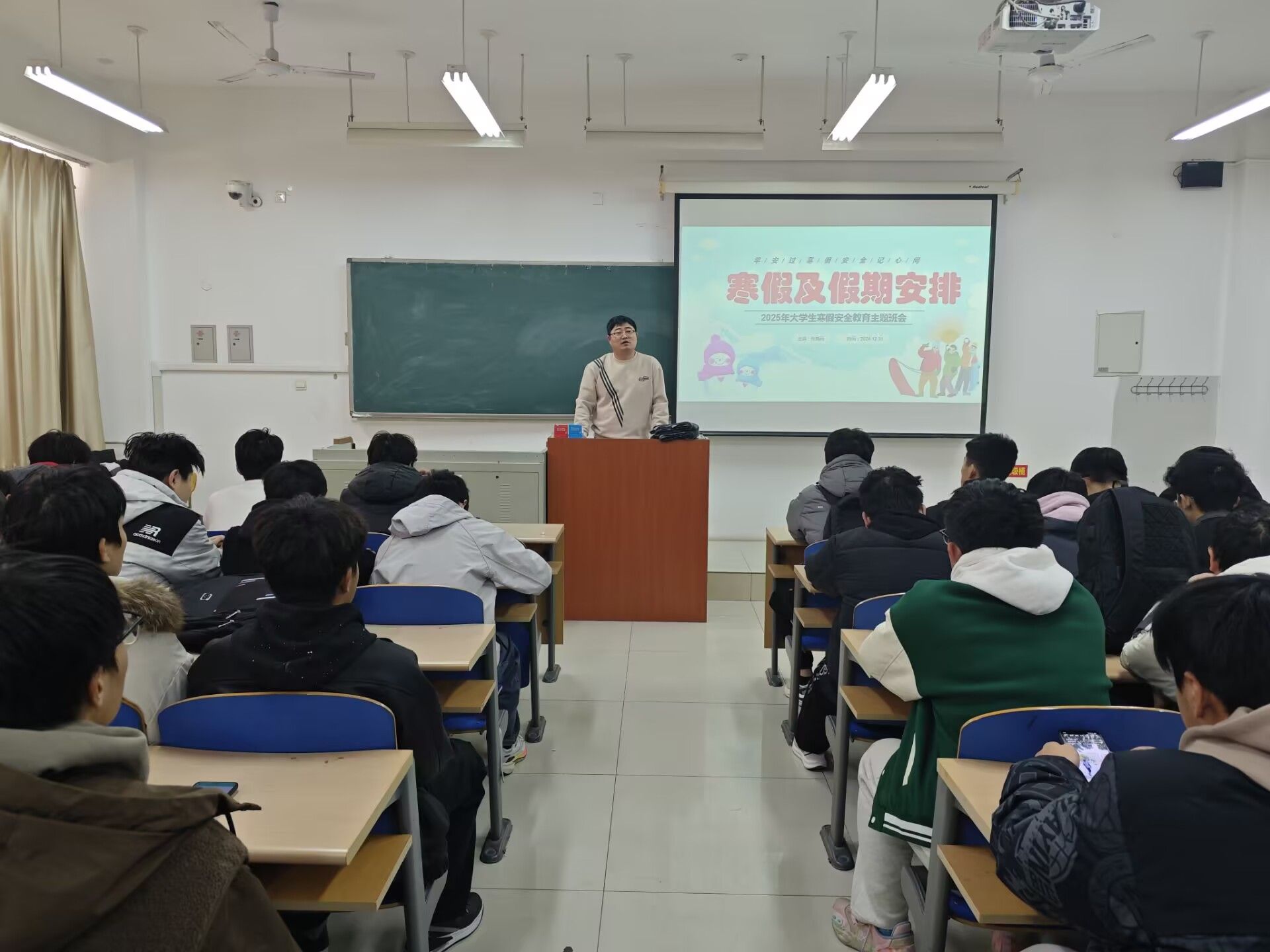 各位辅导员根据本班实际情况进行有针对性的教育,从校园安全、交通安全、假期安全三大方面入手,对学生进行了一次深刻的安全教育。针对假期宿舍安全,强调离校时关水、关电、关门窗,贵重物品带回家;返乡途中及假期外出要注意交通安全,增强安全意识,加强自身防护,防止意外事件发生;要学习防电信诈骗、非法集资、传销、校园贷等方面知识,避免自身利益受到侵害;谨防煤气中毒、烟花爆竹燃放危险、人员聚集踩踏、雨雪冰冻灾害等,进一步增强自我保护意识和能力。同时,提醒同学们要依据返校时间提前安排行程,按时返校。