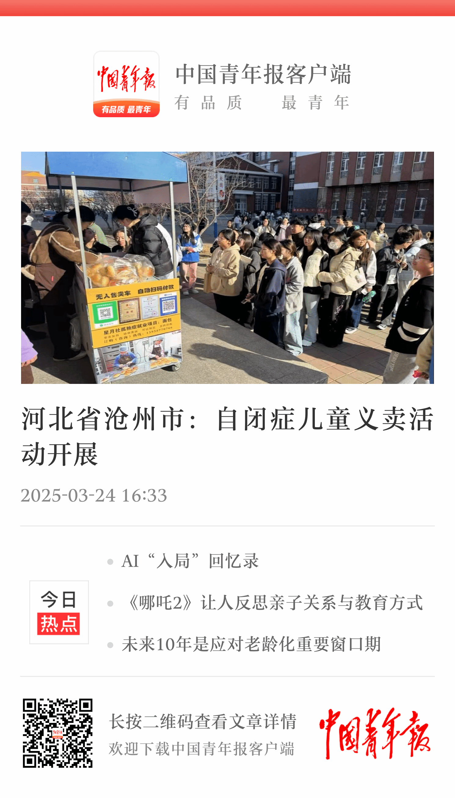 3月18日,我校团委联合共青团沧州市委为自闭症儿童举办的“微光照亮人生,烘焙传递温暖”面包义卖活动被沧州市级媒体报道后引发社会关注。3月24日,中国青年报客户端报道本次主题义卖,进一步扩大了我校的社会影响力。今后,我校将持续深入实施“小橘灯”助残接力计划,并参与更多社会公益活动,持续聚焦特殊儿童和需要帮助的群体,发挥大学生和青年团体的志愿服务优势,扩展志愿服务“实践育人”功能,弘扬奉献精神和社会责任,凝聚起更多爱心力量,营造关心关爱残障青少年的社会氛围,助力特殊儿童成长发展。