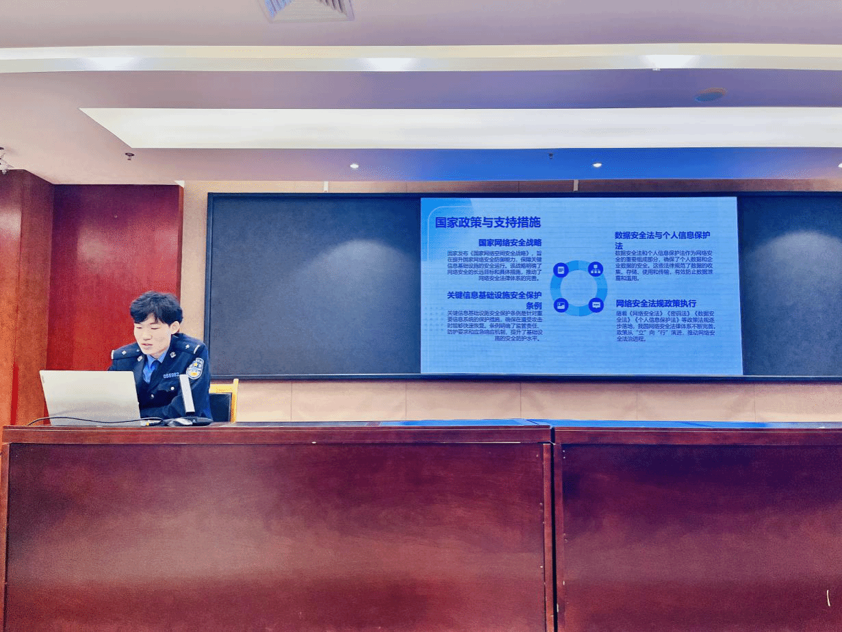 随后,刘昊轩为我校师生作网络安全知识讲座。刘警官从“网络安全概述”“网络安全支持与促进”“网络运行安全”“网络信息安全”“非法翻墙及发表不当言论的法律后果”“法律责任与处罚”以及“附则与条款”等七个方面向在场师生详细介绍了《网络安全法》以及违反《网络安全法》需承担的后果,并通过警示案例,增强了我校师生守法用网意识,提升了安全用网技能。